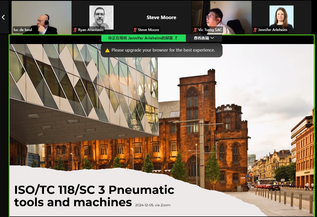 國際標(biāo)準(zhǔn)化組織ISO/TC118/SC3壓縮機、氣動工具、機械和設(shè)備技術(shù)委員會氣動工具和機械分會第24次年度工作會議于2024年12月5日以網(wǎng)絡(luò)視頻的形式召開。來自瑞典、美國、中國的專家和國際標(biāo)準(zhǔn)化組織官員及秘書處人員共12名代表參會,并邀請ISO中央秘書處經(jīng)理和關(guān)聯(lián)標(biāo)委會的委員會經(jīng)理列席了會議。全國鑿巖機械與氣動工具標(biāo)準(zhǔn)化技術(shù)委員會(SAC/TC173)國際對口技術(shù)委員會工作專家王建祖、行業(yè)單位諾霸精密機械(上海)有限公司曾治達總經(jīng)理,代表我國鑿巖機械與氣動工具專業(yè)領(lǐng)域參加了本次會議。